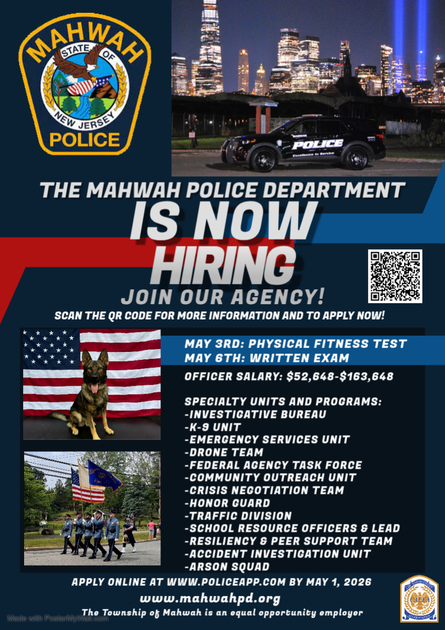 THE TOWNSHIP OF MAHWAH AND MAHWAH POLICE DEPARTMENT ARE EQUAL OPPORTUNITY EMPLOYER. WE CONSIDER APPLICANTS FOR ALL POSITIONS WITHOUT REGARD TO RACE, RELIGION, CREED, GENDER, NATIONAL ORIGIN, AGE, MARITAL OR VETERAN STATUS, SEXUAL ORIENTATION, OR ANY OTHER LEGALLY PROTECTED STATUS. APPLICANTS MAY RE-APPLY FOR SUBSEQUENT TESTS.